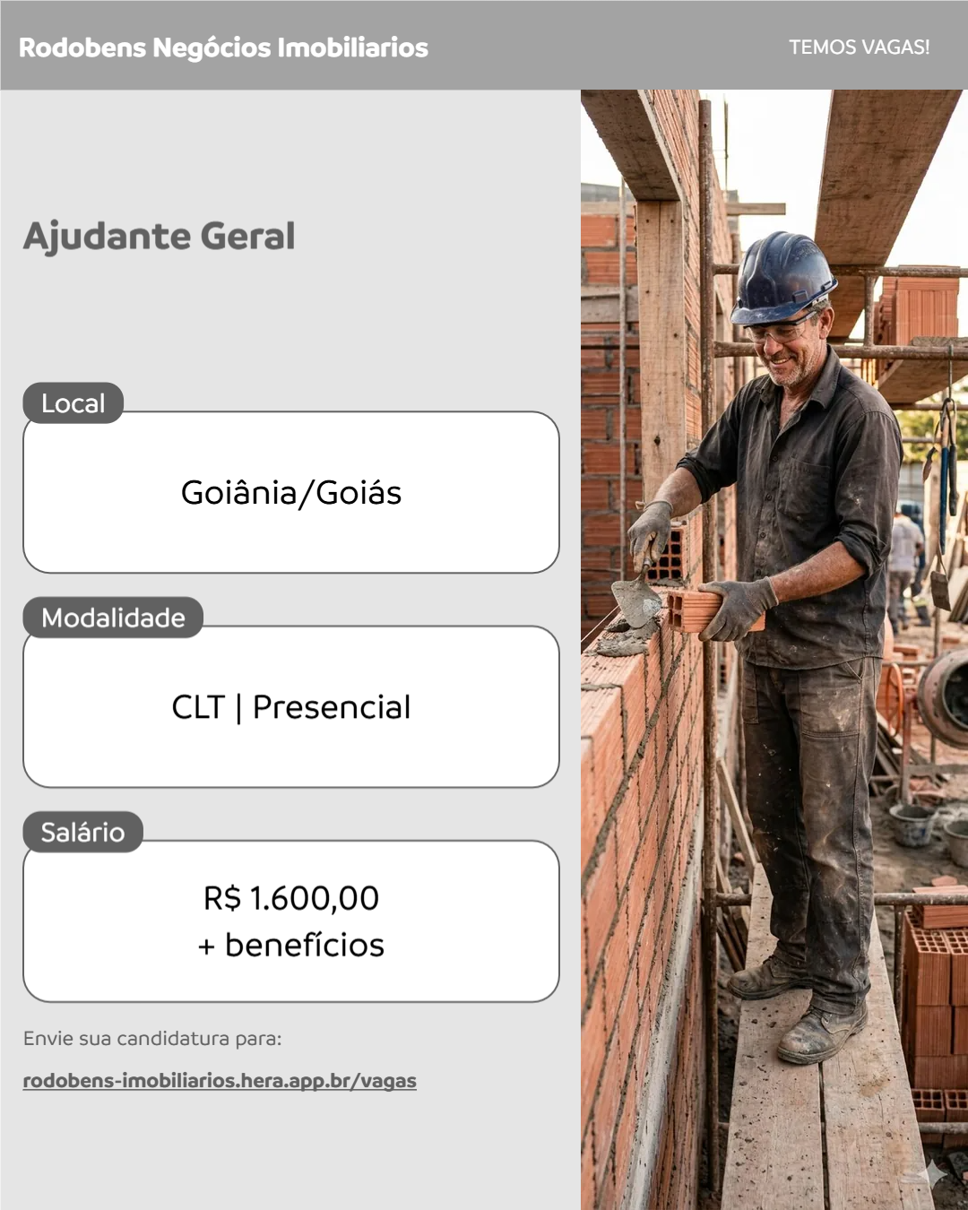 O Ajudante Geral atua no apoio às atividades do canteiro de obras, realizando atendimento no almoxarifado, controle e organização de materiais, além de auxiliar na carga, descarga e transporte. Dá suporte aos profissionais da obra, executando tarefas simples como preparo de argamassa e separação de materiais. Também é responsável pela limpeza e organização do ambiente, zelando pelos equipamentos e cumprindo rigorosamente as normas de segurança do trabalho e os procedimentos da empresa.